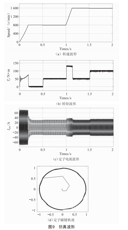 從圖9(a)和(b)轉(zhuǎn)速和轉(zhuǎn)矩的仿真波形可以看出,直接轉(zhuǎn)矩控制對轉(zhuǎn)速和轉(zhuǎn)矩的突變均有很快的響應(yīng)速度,有較好的穩(wěn)態(tài)性能,且超調(diào)量較小。DTC系統(tǒng)在1s開始從800r/min加速到1600r/min過程中,能夠輸出設(shè)定的最大轉(zhuǎn)矩限值,實(shí)現(xiàn)轉(zhuǎn)速的最快調(diào)節(jié)。圖9(c)定子電流波形表明,DTC系統(tǒng)在穩(wěn)定運(yùn)行時(shí)電流基本保持為正弦波,并且在突加負(fù)載時(shí)無過流現(xiàn)象。圖9(d)表明定子磁鏈幅值在動(dòng)態(tài)加速和穩(wěn)態(tài)運(yùn)行時(shí),都能基本保持恒定幅值1,在磁鏈滯環(huán)容差范圍內(nèi)波動(dòng),磁鏈軌跡接近圓形。