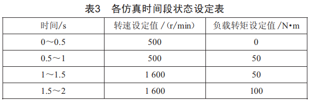 仿真過程中,定子磁鏈幅值給定值為1wb,各仿真時(shí)間段轉(zhuǎn)速、負(fù)載轉(zhuǎn)矩設(shè)定值如表3所示。