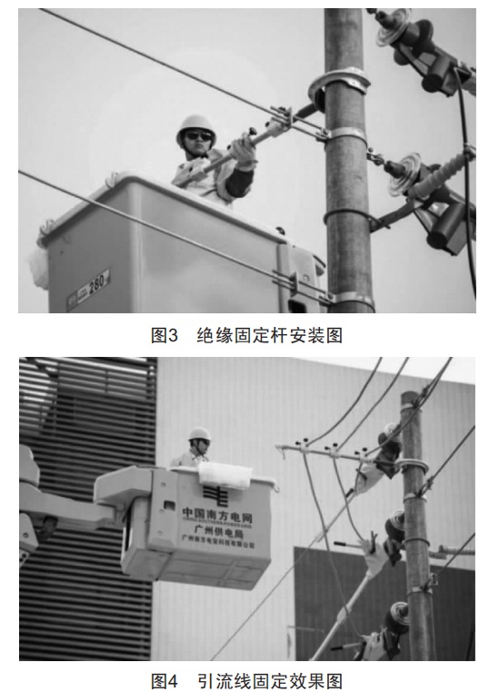 由圖3可見,本絕緣固定桿僅需1人即可完成相應的安裝固定操作,而且安裝固定過程中施工人員可以在離電線桿較遠的地方進行施工。由此可見本絕緣固定桿安裝使用方便,且能讓施工人員在更加安全的地方進行施工,提高作業(yè)安全系數(shù)。此外對引流線進行固定后,如圖4所示,本絕緣固定桿確實能可靠地對引流線進行固定,避免了引流線作業(yè)時發(fā)生單相接地和相間短路問題。
