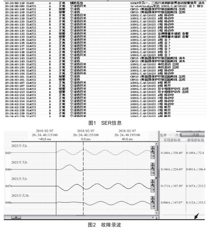 從sER來看,2023遠(yuǎn)方合閘命令發(fā)出后到三相不一致跳開2023斷路器期間,無運(yùn)行人員操作、測控及保護(hù)動(dòng)作信息,如圖1、圖2所示,2023開關(guān)B相無故跳開。
