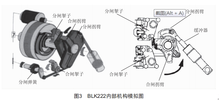 BLK222機(jī)構(gòu)的操動(dòng)機(jī)構(gòu)(圖3)原理:合閘操作時(shí),合閘線圈釋放合閘掣子4即可立即關(guān)合斷路器。合閘拐臂2帶動(dòng)分閘拐臂3逆時(shí)針旋轉(zhuǎn)至合閘位置,在合閘過程中由于分閘拐臂3與合閘拐臂2為偏心結(jié)構(gòu)設(shè)計(jì),合閘拐臂2與分閘拐臂3先脫離,分閘拐臂3在運(yùn)動(dòng)慣性和分閘彈簧的作用下做逆時(shí)針減速旋轉(zhuǎn),越過分閘摯子的閉鎖鋼軸,然后順時(shí)針回轉(zhuǎn)并被分閘掣子閉鎖鋼軸鎖住,保持住分閘彈簧儲存的能量,完成斷路器的合閘操作,合閘拐臂則自由運(yùn)動(dòng)返回到初始位置。