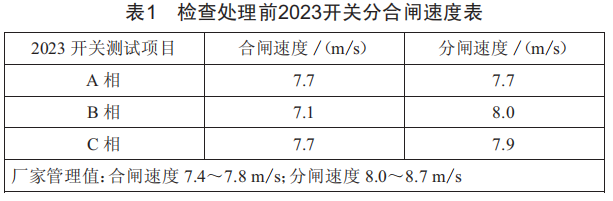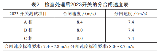 對2023開關(guān)A、B、C三相速度進(jìn)行了測試,測試后卷緊了2023開關(guān)B相合閘彈簧,調(diào)整壓緊了2023開關(guān)A、C相的分閘彈簧,處理復(fù)測后三相機(jī)構(gòu)分合閘速度均滿足標(biāo)準(zhǔn)要求,如表2所示。