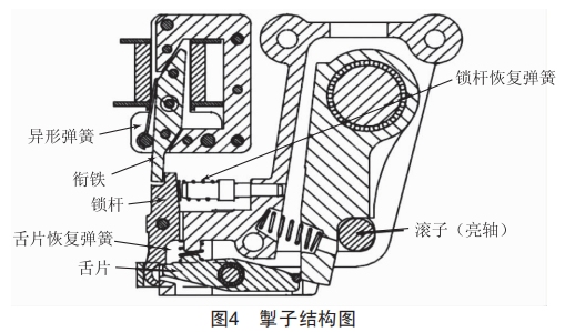 (1)合閘速度過快導(dǎo)致斷路器在合閘操作時(shí)分合閘拐臂逆時(shí)針快速旋轉(zhuǎn),分合閘拐臂分離后,分閘拐臂越過分閘掣子在慣性的作用下減少旋轉(zhuǎn),因轉(zhuǎn)動(dòng)速度超出了正常的范圍,導(dǎo)致分閘拐臂反向撞擊分閘掣子時(shí)撞擊力過大,引起分閘掣子不能可靠地鎖定分閘拐臂而發(fā)生分閘動(dòng)作。掣子結(jié)構(gòu)如圖4所示,在斷路器正常合閘過程中,銜鐵存在不同程度的振動(dòng)并撞擊鎖桿,由于銜鐵異形彈簧、鎖桿恢復(fù)彈簧的存在,鎖桿振動(dòng)幾乎很小,分閘掣子完全能鎖住分閘拐臂使斷路器完成正常合閘操作。當(dāng)分閘拐臂以非正常的能量(速度)沖擊分閘掣子時(shí),沖擊力導(dǎo)致銜鐵振動(dòng)較大,銜鐵碰撞鎖桿,造成鎖桿運(yùn)動(dòng)導(dǎo)致舌片失去閉鎖,并最終導(dǎo)致斷路器分閘。