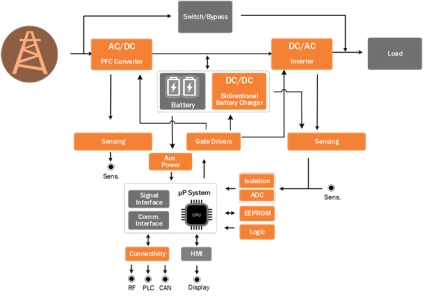 圖1:在線式UPS典型框圖(橙色代表安森美能提供的產(chǎn)品)