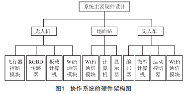 如圖1所示,本系統(tǒng)主要由三大部分組成:無(wú)人機(jī)、地面站和無(wú)人車(chē)。無(wú)人機(jī)在原有的飛行器控制模塊基礎(chǔ)上,增加RGBD傳感器、板載計(jì)算機(jī)以及wiFi通信模塊:地面站搭載了計(jì)算機(jī)、顯示器以及wiFi通信模塊:無(wú)人車(chē)搭載了微型計(jì)算機(jī)、運(yùn)動(dòng)控制器、編碼器以及wiFi通信模塊。