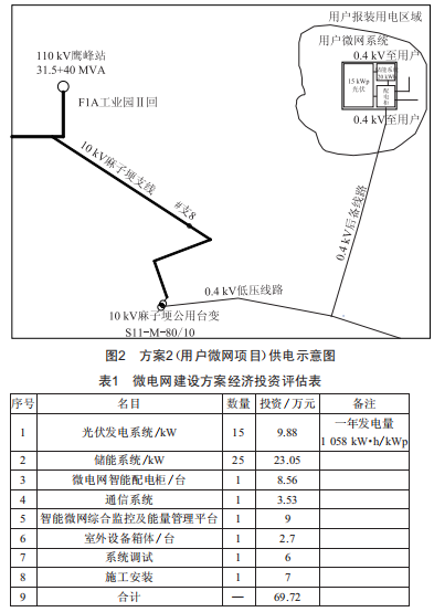 以麻子頃配變臺區(qū)的兩處低壓報裝用戶(總報裝容量預計30kw)為例,考慮以下兩種供電方案:方案1為常規(guī)業(yè)擴報裝建設方案,通過延伸10kV線路并新建配變解決其供電問題:方案2為用戶微網(wǎng)建設方案,通過建設光儲微網(wǎng)就地解決用戶供電問題。