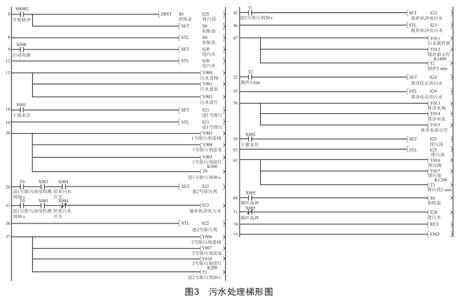 除污罐中的污水處理按任務要求可細分為7個控制過程,這些控制過程間存在嚴格的時序關系,據此可用狀態(tài)轉移圖SFC語言來描述順序結構的狀態(tài)編程,并將SFC程序轉換成步進梯形圖程序。圖2為污水處理裝置步進控制狀態(tài)流程圖,根據此狀態(tài)流程圖,編寫出SFC程序梯形圖,如圖3所示。