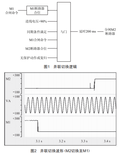 M1合閘命令發(fā)出后,會保持2n,當保護裝置檢測到M1斷路器已合閘,同時存在合閘命令,將會跳開M2斷路器,完成中壓母線的并聯(lián)切換。