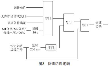 備用進線斷路器快速切換邏輯如圖3所示,通過sEL-351保護裝置實現(xiàn)功能。快切開放時間僅200ms,若200ms內快切未完成,則會被閉鎖,以保證合閘時的安全。
