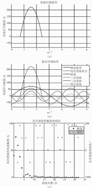 運(yùn)行結(jié)果如圖1和表1所示 。 圖1中原始時域波形是整流器入口的電流波形 ,驗(yàn)證時域波形中包含基波、2~4次諧波、1~32次諧波組合的波形和256次以下諧波組合的波形。與原始波形比較 ,驗(yàn)證時域波形基本上看不出差別 , 說明32次以下諧波已經(jīng)可以相當(dāng)精確地復(fù)原原始波形了 。 圖 1 (b)是直流、基波和32次以下諧波的幅值和相位。表1以數(shù)字形式列出了32次以下諧波的幅值和相位 。從表中可以看出 ,半波整流設(shè)備會產(chǎn)生偶次和奇次諧波 , 所產(chǎn)生的諧波幅值是逐漸降低的 。