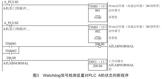 (2)watchdog信號(hào)檢測(cè)裝置對(duì)PLCA的狀態(tài)判斷程序如圖3所示 。watchdog信號(hào)檢測(cè)裝置對(duì)PLCB的狀態(tài)判斷程序與PLCA一致 。