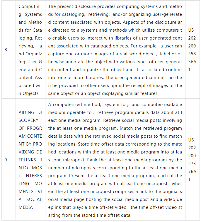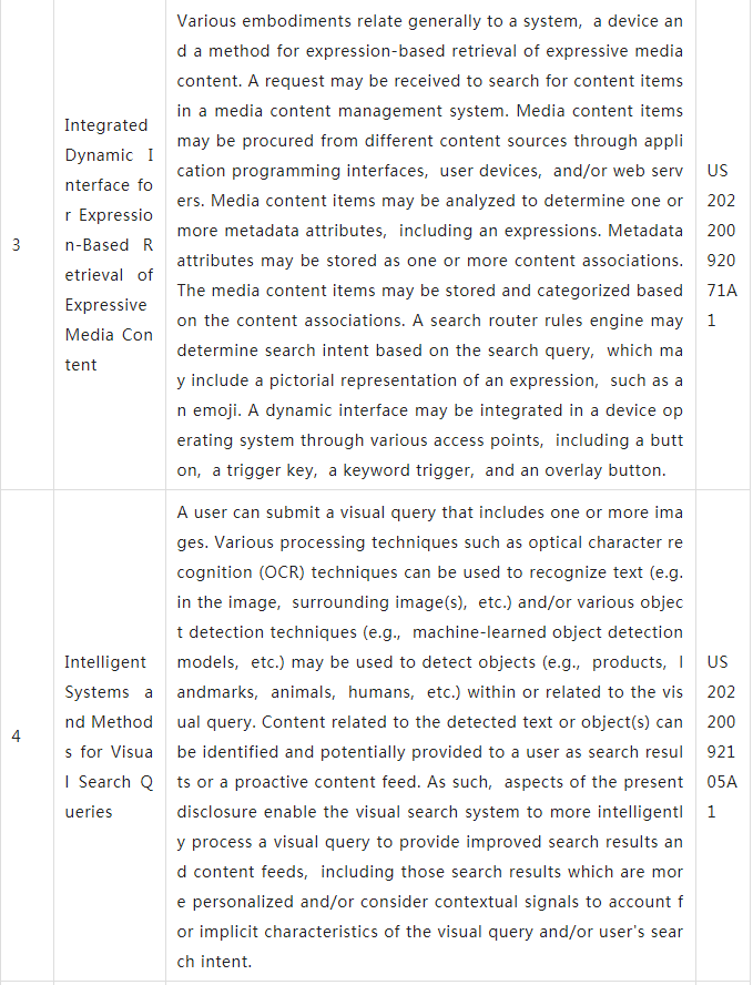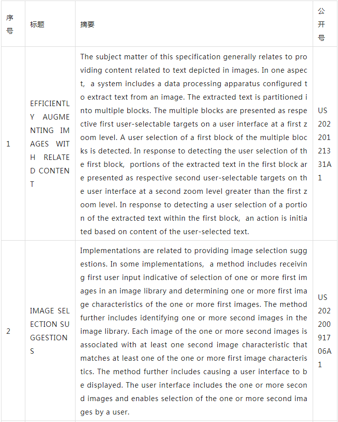 下表為9件為谷歌近期公開(kāi)圖像檢索+識(shí)別領(lǐng)域的專利。