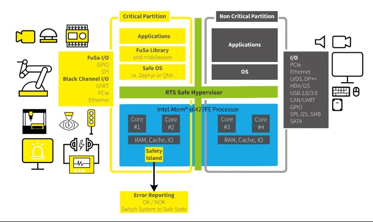 該動(dòng)態(tài)展示采用具備功能安全的COM Express Mini模塊conga-MA7,其搭載通過(guò)FuSa認(rèn)證的英特爾CPU x6427FE(支持 英特爾Safety Island),在基于RTS虛擬機(jī)監(jiān)控器和集成實(shí)時(shí)Linux系統(tǒng)上展示功能安全性。該動(dòng)態(tài)演示有力地證明了康佳特在FuSa方面邁出了一大步,認(rèn)證了首批基于英特爾凌動(dòng)®x6000 E處理器 (代號(hào)Elkhart Lake) 的計(jì)算機(jī)模塊,而后的模塊也會(huì)持續(xù)通過(guò)FuSa認(rèn)證。OEM廠商現(xiàn)在就能立即開(kāi)始將功能安全認(rèn)證的康佳特模塊、BSP和軟件組件整合進(jìn)他們的應(yīng)用平臺(tái),康佳特也會(huì)協(xié)助OEM客戶滿足他們的定制需求,例如組件選擇、載板整合、操作系統(tǒng)及虛擬機(jī)監(jiān)控器支持,亦或是提供符合標(biāo)準(zhǔn)的I/O驅(qū)動(dòng)程序。