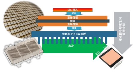 為提高功率輸出,散熱至關(guān)重要。為了達(dá)到最佳的散熱效果,安森美VE-TracTM Direct SiC采用最新的銀燒結(jié)工藝,將SiC裸芯直接燒結(jié)在DBC上,DBC焊接到Pin Fin底板,底板下是冷卻液,這樣,芯片結(jié)和冷卻液之間的直接冷卻路徑有助于大大減少間接冷卻的熱阻,從而確保更大的功率輸出,如1.7 m? Rdson 的VE-TracTM Direct SiC熱阻達(dá)到0.10℃/W,比VE-TracTM Direct IGBT的熱阻低20%。