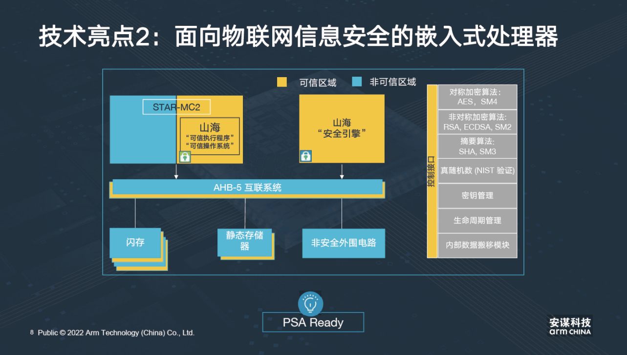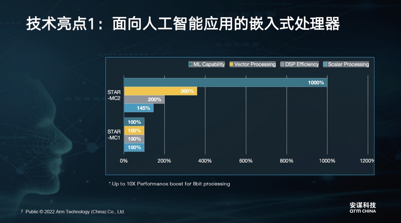 基于上述種種技術(shù)創(chuàng)新,STAR-MC2帶來了幾大優(yōu)勢。首先STAR MC-2是第一款支持8-Bit計(jì)算的處理器,它的AI處理能力提升了9倍,因此更適用于一些輕量級(jí)的AI應(yīng)用計(jì)算場景。在安全方面,STAR-MC2支持Arm主推的PSA-Ready,與 “山海”解決方案相配合,可以提供一個(gè)完整的物聯(lián)網(wǎng)安全解決方案。另一個(gè)關(guān)鍵的技術(shù)亮點(diǎn)在于,STAR-MC2支持最高級(jí)別的車規(guī)功能安全,安謀科技不僅僅給客戶提供包含RTL的傳統(tǒng)處理器IP,也會(huì)為給客戶提供一個(gè)包含所有必要數(shù)據(jù)的功能安全包,以確保客戶可滿足最高車規(guī)級(jí)新品的功能安全要求。