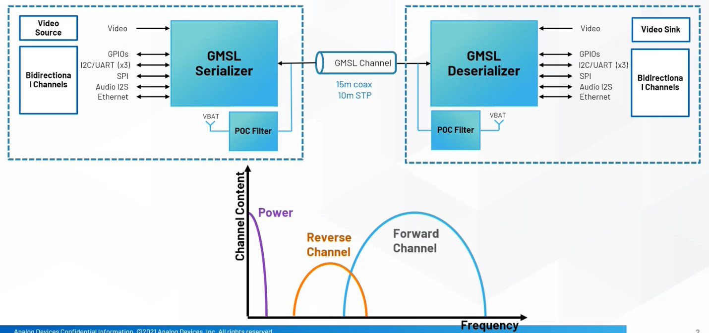 ADI GMSL技術(shù)作為SerDes的一種,串行器與解串器芯片的互操作性允許鏈路兩側(cè)使用不同接口,廣泛適用于車內(nèi)UHD視頻、音頻、控制信息、組合傳感器等數(shù)據(jù)的高速傳輸。GMSL通信介質(zhì)支持長(zhǎng)達(dá)15m同軸電纜或10m-15m屏蔽雙絞線電纜,具有相當(dāng)大的配置靈活性和成本優(yōu)勢(shì),同時(shí)滿足汽車行業(yè)最苛刻的電磁兼容要求。