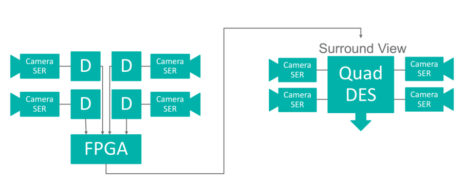不僅如此,GMSL解串器內(nèi)部集成了圖像處理功能,在接收到GMSL串行化的數(shù)據(jù)后可直接進(jìn)行解串與圖像處理,根據(jù)客戶需求進(jìn)行多路圖像信息的拼接還原,并呈現(xiàn)于車載顯示屏上,節(jié)省了中央處理器平臺(tái)進(jìn)行圖像處理的延時(shí)。GMSL還支持同軸電纜電力傳輸(POC),因此可將串行器芯片集成至攝像頭內(nèi)部,直接實(shí)現(xiàn)由車機(jī)系統(tǒng)為攝像頭運(yùn)行供電。