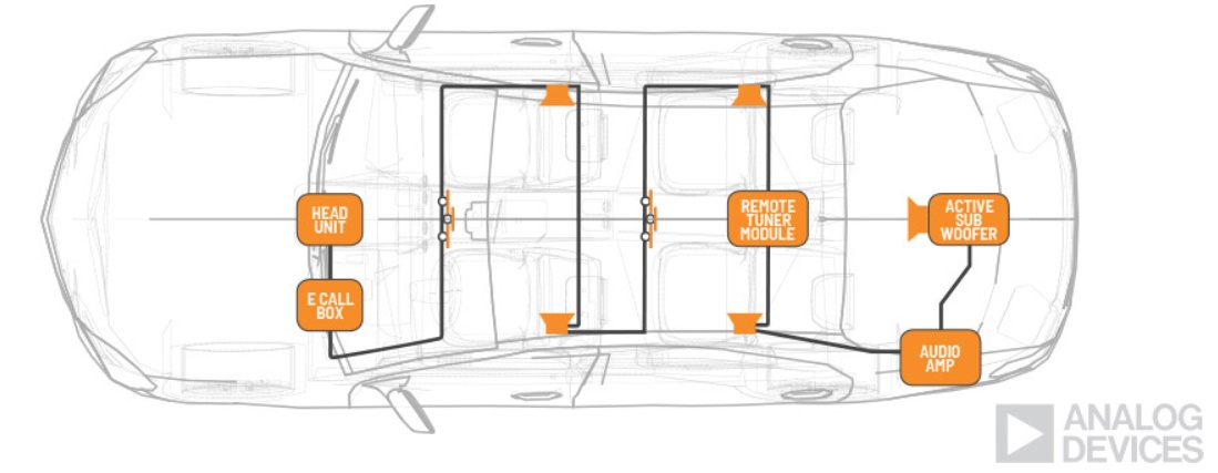 同樣是在智能座艙內(nèi),車用音頻已經(jīng)從過(guò)去單純的娛樂(lè)系統(tǒng)向信號(hào)輸入、觸發(fā)、處理與反饋的方向發(fā)展,并開(kāi)始與汽車駕駛緊密結(jié)合。ADI創(chuàng)新性的A2B音頻總線技術(shù)把原來(lái)傳統(tǒng)的模擬音頻傳輸轉(zhuǎn)化成了數(shù)字音頻傳輸方案,可提供高保真音頻,并使音頻布線重量減少75%,從而提高燃油效率。除了讓布線更簡(jiǎn)單外,A2B還有更多的創(chuàng)新應(yīng)用,比如更適應(yīng)高級(jí)音頻算法,可憑借DSP算法確保車內(nèi)不同位置的音區(qū)獨(dú)立性,以及實(shí)現(xiàn)回聲消除、配合麥克風(fēng)和功放進(jìn)行ANC主動(dòng)降噪等功能。