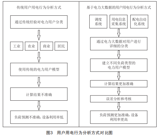 和傳統(tǒng)的用戶用電行為分析相比較,以電力大數(shù)據(jù)為基礎(chǔ)的用戶用電行為分析的準(zhǔn)確性更高,且能夠有效提升用戶用電設(shè)備的使用效率。圖3為兩種用戶用電行為分析方式的對比圖。
