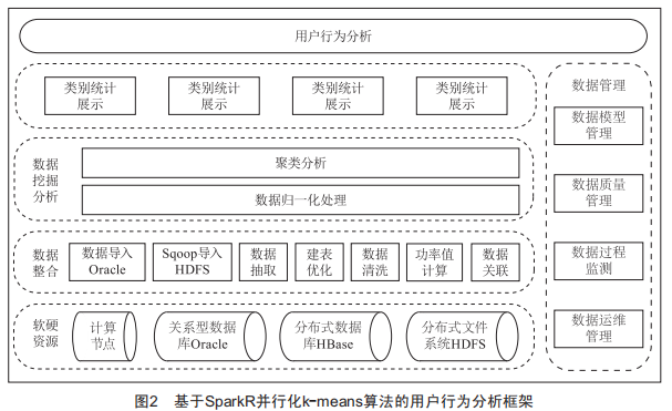 目前,在電力大數(shù)據(jù)平臺中比較常用的電力大數(shù)據(jù)用戶用電行為分析方法是以云計算為基礎(chǔ)的k二means算法。以sparkR為基礎(chǔ)的并行化k二means算法能夠有效解決設(shè)備性能問題以及頻繁讀寫可能存在的錯誤情況,其將Hadoop的電力大數(shù)據(jù)群作為數(shù)據(jù)引擎,再運用k二means算法充分發(fā)揮了大數(shù)據(jù)R語言以及大數(shù)據(jù)內(nèi)存計算的特征,有效提升了數(shù)據(jù)分析能力。圖2為基于SparkR并行化k二means算法的用戶行為分析框架圖,可以將整個過程大體分為數(shù)據(jù)計算、清洗以及用戶用電行為的聚類分析。