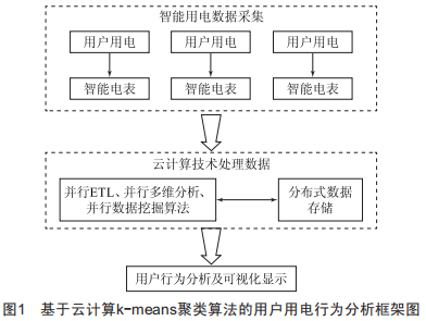 模糊聚類算法中使用比較廣泛的是模糊C均值聚類算法,這種方法能夠通過對目標(biāo)函數(shù)予以優(yōu)化獲取每個樣本點對不同類中心的隸屬度,樣本點隸屬的判斷需要以實現(xiàn)樣本數(shù)據(jù)分類為目標(biāo)。但是,使用模糊C均值類算法對離散數(shù)據(jù)點集合進(jìn)行處理時,無法處理類型比較特殊的數(shù)據(jù),無法對數(shù)據(jù)是否具備聚類結(jié)構(gòu)進(jìn)行判斷,并且在選擇初始值時具有較強的依賴性。一些學(xué)者提出了以云計算為基礎(chǔ)的電力大數(shù)據(jù)聚類問題的計算方法,這種方法能夠同時處理大量數(shù)據(jù),并且速度也比較快,但是在具體使用過程中,因Hadoop讀寫比較頻繁,而且包含的數(shù)據(jù)量比較大,很容易產(chǎn)生性能方面的問題。對于大數(shù)據(jù)用戶用電行為,使用經(jīng)典聚類算法進(jìn)行分析的時候存在問題,因此出現(xiàn)了很多改進(jìn)算法,比如,以云計算為基礎(chǔ)的k二means算法、以sparkR為基礎(chǔ)的并行化k二means算法等。對電力大數(shù)據(jù)用戶的用電行為進(jìn)行分析的時候,使用云計算k二means算法有利于開發(fā)大規(guī)模的數(shù)據(jù)并對其進(jìn)行處理,還能夠顯著提升處理能力,使數(shù)據(jù)處理更加高效。運用云計算,能夠在數(shù)據(jù)庫中存儲海量的電力大數(shù)據(jù),并且借助k二means計算模型高效分析數(shù)據(jù)。圖1為基于云計算k二means聚類算法的用戶用電行為分析框架圖。