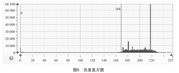 可得到一個分割后的二值化圖像。閾值分割使用的算子是threshold。具體代碼為threshold(Im一geReduced4Regioas404168):此處選取的是閾值范圍是0~168的區(qū)域。其灰度直方圖如圖6所示,橫坐標(biāo)表示灰度值,縱坐標(biāo)表示各個灰度值的像素在圖像中出現(xiàn)的頻率。