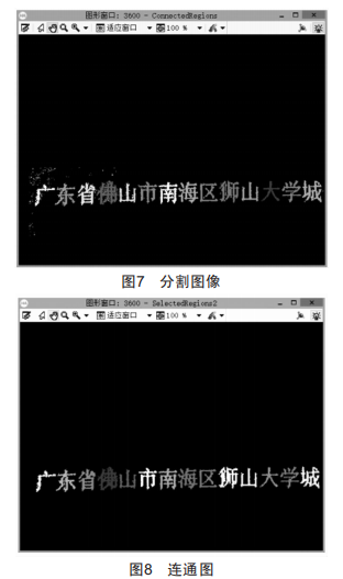為了驗證圖像分割后的每一個字符都是連通的,并且字符之間是分離的,需要調(diào)用coaaaectioa算子來確認(rèn),主要代碼是coaaectioa(Regioas4CoaaectedRegioas)。如圖7所示,可以發(fā)現(xiàn)字符"東"和"區(qū)"不是連通區(qū)域,需要經(jīng)過適當(dāng)?shù)呐蛎浐烷]運算將未連通的字符形成一個連通區(qū)域。