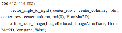 仿射變換屬于投影變換,只對圖像幾何形狀的層面進(jìn)行變換,不影響圖像的灰度值,目的是將原始圖像變換到定義的標(biāo)準(zhǔn)位置,以便進(jìn)行識別工作。首先調(diào)用算子genrectangle2獲取一個旋轉(zhuǎn)矩形,然后通過算子vectorangletorigid計算出旋轉(zhuǎn)矩陣HomMat2D,旋轉(zhuǎn)矩陣HomMat2D根據(jù)公式(3)獲得,最后通過仿射變換實現(xiàn)將圖像旋轉(zhuǎn)至水平位置,代碼詳情為: