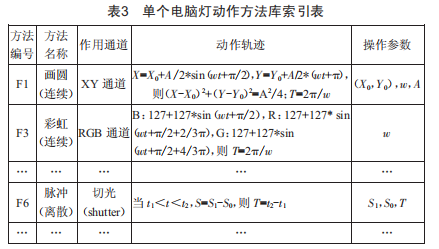 為實現(xiàn)多層次豐富的燈光變換,需進行燈光區(qū)域、燈光場景、單燈動作方法(作用通道、動作軌跡、操作參數(shù))、多燈組合變化(組合個數(shù)、分組動作進行方向、分組動作間隔時間)等方面的設(shè)計匹配。根據(jù)單燈基本動作特征及演示效果,建立如表3所示的方法庫索引表,動作方法概括為連續(xù)和離散兩種變化方式。