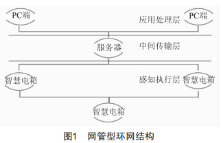 電力設(shè)備監(jiān)測系統(tǒng)分為3層:設(shè)備端、服務(wù)器及PC端。智慧電箱作為設(shè)備端進(jìn)行數(shù)據(jù)采集,執(zhí)行分閘或合閘命令以及監(jiān)測數(shù)據(jù):數(shù)據(jù)服務(wù)器對智慧電箱上傳的設(shè)備狀態(tài)數(shù)據(jù)進(jìn)行實(shí)時(shí)數(shù)據(jù)處理、顯示或轉(zhuǎn)發(fā)給主控室PC端:PC端用于對電箱進(jìn)行遠(yuǎn)程控制和用電設(shè)備的實(shí)時(shí)監(jiān)控。如圖1所示,本系統(tǒng)與網(wǎng)管型環(huán)網(wǎng)交換機(jī)結(jié)合后,利用光纖環(huán)形網(wǎng)絡(luò)建立比現(xiàn)在單向網(wǎng)絡(luò)更加安全的通信鏈路,不會因?yàn)橄到y(tǒng)某一方向光纖斷連,造成設(shè)備數(shù)據(jù)丟失,且系統(tǒng)會實(shí)時(shí)監(jiān)測網(wǎng)絡(luò)狀態(tài),如果單一方向光纖故障,設(shè)備會通過另外的數(shù)據(jù)鏈路發(fā)送數(shù)據(jù)并報(bào)警,提示及時(shí)維護(hù)。