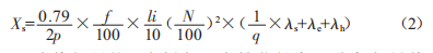 式中,Xs為繞組漏抗:f為頻率:li為鐵芯長(zhǎng)度:N為每相導(dǎo)體數(shù):入s為定子槽比漏磁導(dǎo):入e為定子端部比漏磁導(dǎo):入h為諧波比漏磁導(dǎo):p為極數(shù):g為每極每相槽數(shù)。