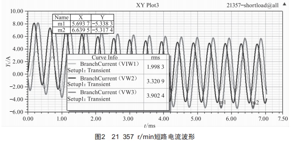 對(duì)樣機(jī)進(jìn)行負(fù)載短路實(shí)驗(yàn),在2I357r/min轉(zhuǎn)速下,將3套繞組輸出端分別短路,對(duì)發(fā)電機(jī)進(jìn)行試驗(yàn)測(cè)試。實(shí)測(cè)結(jié)果如表2所示。