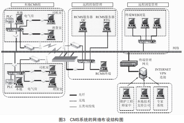 圖3為CMS系統(tǒng)的網(wǎng)絡(luò)布設(shè)結(jié)構(gòu)圖。該系統(tǒng)應(yīng)用了無線網(wǎng)絡(luò)技術(shù)、S0L數(shù)據(jù)庫技術(shù)以及可編程控制信息傳輸技術(shù)。隨著這些技術(shù)的不斷完善與發(fā)展,CMS遠(yuǎn)程監(jiān)控系統(tǒng)能夠得以實現(xiàn)。從系統(tǒng)的設(shè)計意義上來看,實現(xiàn)集裝箱生產(chǎn)的實時監(jiān)控,利用GPS能夠提供大車的實時位置信息,以及CMS監(jiān)控系統(tǒng)提供的場地箱區(qū)信息、設(shè)備本身信息以及實時監(jiān)控到各個設(shè)備的準(zhǔn)確位置。在作業(yè)過程中能夠快速了解當(dāng)前正在吊裝哪些集裝箱,提高監(jiān)控實時性,在最快的時間內(nèi)了解現(xiàn)場作業(yè)情況,及時制止錯誤作業(yè)的發(fā)生。其次,能夠?qū)崿F(xiàn)工單管理的智能化,由于采用了S0L數(shù)據(jù)庫用于信息儲存,便于實現(xiàn)資產(chǎn)管理系統(tǒng)的數(shù)據(jù)信息共享,利用CMS數(shù)據(jù)實時信息生成故障實施工單,利用動態(tài)設(shè)備運行和作業(yè)量統(tǒng)計生成相應(yīng)的維修保單,實現(xiàn)設(shè)備的動態(tài)化管理,改變過去僅依靠人力管理設(shè)備的理念,使得現(xiàn)代設(shè)備管理更具科學(xué)化。具有WEB互聯(lián)網(wǎng)瀏覽功能,同時利用異地遠(yuǎn)程監(jiān)控實現(xiàn)WEB網(wǎng)絡(luò)瀏覽,能夠使所有用戶看到目前設(shè)備的運行狀態(tài),還可通過遠(yuǎn)程局域網(wǎng)便于異地開展設(shè)備監(jiān)控和相應(yīng)的技術(shù)支持。當(dāng)系統(tǒng)在運行過程中出現(xiàn)故障報警時,能夠準(zhǔn)確給出故障點,便于分析故障,縮短故障時間。該系統(tǒng)同生產(chǎn)系統(tǒng)實現(xiàn)無線網(wǎng)共用,利用無線網(wǎng)絡(luò)技術(shù),能夠減少在傳輸過程中產(chǎn)生的信息量,生產(chǎn)系統(tǒng)的無線網(wǎng)絡(luò)通信量達(dá)30M,因此共網(wǎng)使用對于生產(chǎn)系統(tǒng)影響不大,解決了網(wǎng)橋間的融合通信問題,整合了企業(yè)在管理過程中的業(yè)務(wù)流程,減輕設(shè)備工作量,不斷提高企業(yè)的設(shè)備管理水平,提高設(shè)備利用效率:更好地規(guī)范企業(yè)管理以及提高信息化水平,降低生產(chǎn)成本,提高勞動效率,進(jìn)一步提升企業(yè)在市場中的核心競爭力。