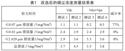 在整個測試過程中,除塵器其他電場供電電源的參數(shù)保持不變,脈沖電源采用基礎(chǔ)、基礎(chǔ)+脈沖兩種方式相結(jié)合的運行方式。根據(jù)表1的4次測試能夠看出,增加脈沖電源后,對粒徑小于0.07um顆粒的除塵效果非常明顯,減少率高達(dá)77%,而對其他兩種粒徑粉塵的去除效果并不明顯。因此,脈沖電源適用于微細(xì)粉塵的脫除,可大大提高除塵效果。