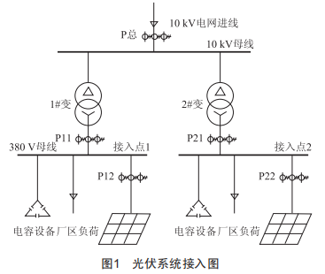 某家用電器設(shè)備生產(chǎn)廠家在廠房屋頂安裝了2.2Mw分布式光伏發(fā)電站,分兩個(gè)并網(wǎng)點(diǎn)分別接入廠區(qū)配電網(wǎng)1#變1000kVA和2#變1600kVA變壓器低壓側(cè)AC380V母線,低壓AC380V母線上已分別配置了無(wú)功補(bǔ)償裝置,如圖1所示。在光伏發(fā)電系統(tǒng)接入用戶配電網(wǎng)運(yùn)行一段時(shí)間后,反饋當(dāng)光伏發(fā)電功率處于廠內(nèi)負(fù)荷功率臨界點(diǎn)時(shí),無(wú)功補(bǔ)償裝置測(cè)量的功率因數(shù)不穩(wěn)定,導(dǎo)致廠區(qū)電容器反復(fù)投切。