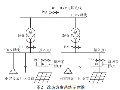 盡管將接入點(diǎn)設(shè)在采樣CT以上可以解決很多無(wú)功補(bǔ)償異常問(wèn)題,但由于電網(wǎng)考核點(diǎn)一般設(shè)在計(jì)量點(diǎn)處,所以該解決方法并不能從本質(zhì)上解決光伏電站接入配電網(wǎng)后引起的功率因數(shù)低而導(dǎo)致電網(wǎng)罰款的問(wèn)題。