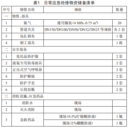 對于氨區(qū)系統(tǒng)設(shè)備,不同部位的液氨應(yīng)急處置搶修、氨氣泄漏應(yīng)急處置搶修、管閥的堵塞應(yīng)急搶修的方法也有所不同,只有采取正確的應(yīng)急搶修方法,才能盡快安全地解決問題,同時避免氨氣外排導(dǎo)致的環(huán)境污染問題。