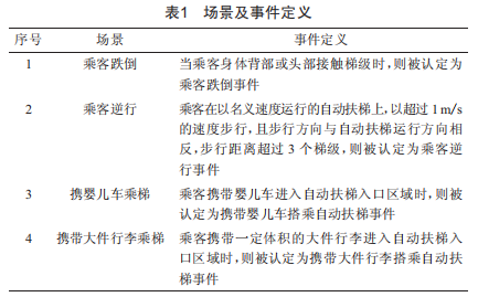 通過自動扶梯上方攝像頭對扶梯上乘客的行為抓拍,結(jié)合圖像分析軟件預(yù)設(shè)的事件定義,對滿足觸發(fā)條件的行為進(jìn)行警示,車控室監(jiān)控平臺自動跳出操作指示。采用的場景及事件定義如表1所示。