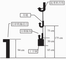 事故現(xiàn)場的分布情況如圖1所示?,F(xiàn)場鋼材和打砂機(jī)輸送臺以及索具的相對高度如圖4所示。