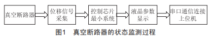真空斷路器是電力系統(tǒng)中的重要組成元素,要想提高電力系統(tǒng)運行的穩(wěn)定性,在對設(shè)備狀態(tài)進行監(jiān)測過程中,技術(shù)人員需明確真空斷路器的分閘、合閘斷開時間、運行速度以及其他運行參數(shù),針對性地實施監(jiān)控。真空斷路器的狀態(tài)監(jiān)測過程如圖1所示。