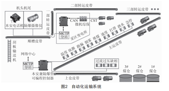 以全自動(dòng)帶式傳輸機(jī)為例,其可以說是當(dāng)前技術(shù)條件下,煤礦生產(chǎn)中應(yīng)用最為廣泛的自動(dòng)化設(shè)備之一,但是因?yàn)楦鞣N因素的影響,全自動(dòng)帶式傳輸機(jī)在運(yùn)行過程中,存在安全系數(shù)偏低的問題,連續(xù)作業(yè)情況下,容易導(dǎo)致風(fēng)險(xiǎn)隱患的增大,嚴(yán)重時(shí)甚至可能對(duì)煤礦井下作業(yè)的實(shí)施產(chǎn)生阻礙。針對(duì)這樣的問題,技術(shù)人員應(yīng)該做好對(duì)于自動(dòng)化傳輸設(shè)備的研究工作,改善設(shè)備的工作性能,確保設(shè)備能夠更好地適應(yīng)時(shí)代發(fā)展要求。自動(dòng)化運(yùn)輸系統(tǒng)如圖2所示。