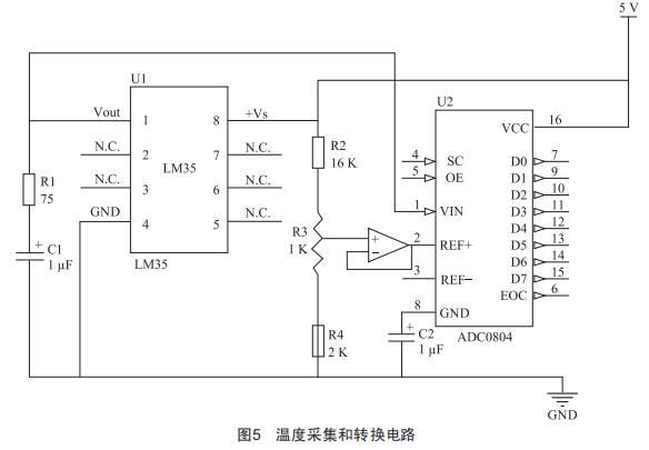系統(tǒng)設(shè)計(jì)采用了5L32芯片實(shí)時(shí)采集環(huán)境溫度,因它可輸出溫度為0M時(shí)的電壓值,并且檢測精度高,可達(dá)±0.6℃,抗干擾能力較強(qiáng),線性度較好。跟Ds18B+0溫度傳感器不同的是,Ds18B+0輸出的是數(shù)字信號(hào),可直接傳輸?shù)街骺匦酒M(jìn)行信號(hào)處理,而5L32輸出的是電壓值,屬模擬信號(hào),因此需要A/D轉(zhuǎn)換模塊的ADC0804芯片把電壓信號(hào)轉(zhuǎn)換成數(shù)字信號(hào),才能送入DSP系統(tǒng)進(jìn)行處理。溫度采集和轉(zhuǎn)換電路如圖5所示。