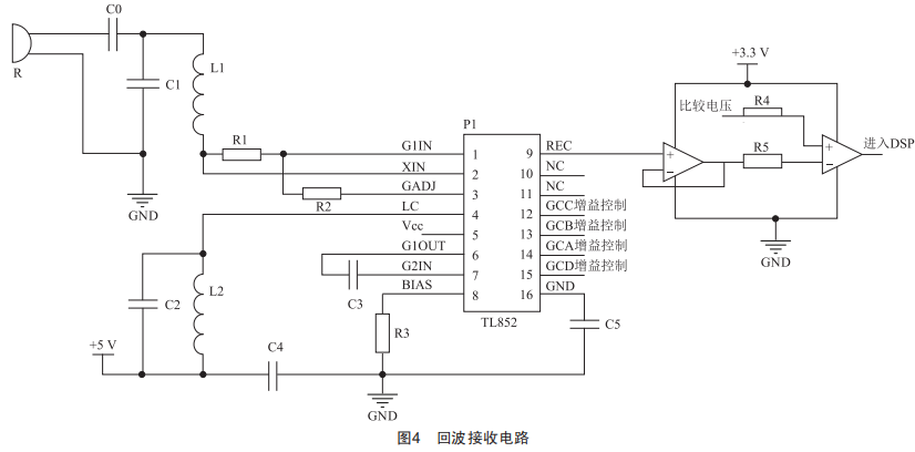 超聲波發(fā)射后遇到障礙物反射形成回波,為提高回波采集信號(hào)的穩(wěn)定性和準(zhǔn)確性,本設(shè)計(jì)采用具有放大、濾波、增益和整形功能的TL852作為超聲波接收芯片,外加電壓比較器組成回波接收電路,把采集整理后的回波模擬信號(hào)經(jīng)過A/D轉(zhuǎn)換模塊變成數(shù)字信號(hào)后,送入DSP系統(tǒng)進(jìn)行反饋和處理,回波接收電路如圖4所示。
