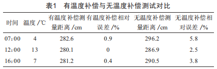 選擇一天之中的不同時(shí)間段,對(duì)該系統(tǒng)進(jìn)行有溫度補(bǔ)償?shù)臏y距精確度測試,以無溫度補(bǔ)償測距作為參考組,測得的數(shù)據(jù)如表1所示。