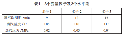 通過前期經(jīng)驗(yàn)積累及觀察,在抽油煙機(jī)清洗過程中,清洗時(shí)間、清洗的蒸汽溫度、清洗的蒸汽壓力對清洗效果均有很大影響,因此本文選擇上述3個(gè)變量因子作為實(shí)驗(yàn)變量,探究其對清洗效果的影響。根據(jù)實(shí)際情況,每個(gè)因子分3個(gè)水平段,各變量的取值情況如表1所示。