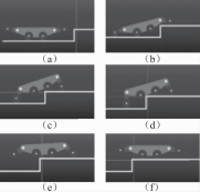 為了驗證機器人的越障性能,在ADAMs中建立了臺階虛擬障礙,并根據(jù)結(jié)構(gòu)設(shè)計與優(yōu)化的參數(shù)建立了機器人虛擬樣機模型,進(jìn)行運動學(xué)仿真。機器人跨越臺階的過程如圖6所示,從仿真可知,機器人可通過調(diào)整前后擺臂姿態(tài)實現(xiàn)質(zhì)心調(diào)節(jié),并適應(yīng)障礙高度,驗證了多輪腿機構(gòu)的可行性。