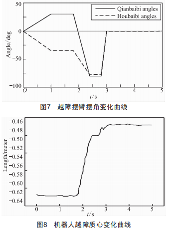 越障過程中前后擺臂腿擺動角度的運動曲線如圖7所示,曲線說明,擺臂運動規(guī)劃過程為典型階躍過程,擺動角度范圍為[-759,259],說明所設(shè)計的擺動角度閾值合理。