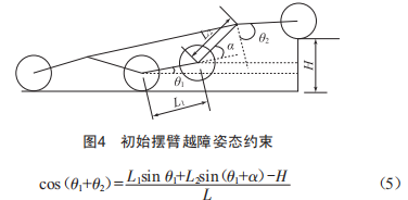 輪式機器人的越障能力主要由前擺臂確定,初始擺臂姿態(tài)約束如圖4所示,則有: