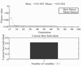 式(5)即為約束條件。由機器人結(jié)構(gòu)可知,決策變量主要是行走輪心之間的距離L1、擺臂長度L、車輪的半徑R以及車體傾角91。利用GA遺傳算法設(shè)置相關(guān)參數(shù)變化范圍,選擇最優(yōu)適應(yīng)度和個體,基于MATLAB的選擇過程如圖5所示,經(jīng)過約70代優(yōu)化迭代,可確定擺臂腿的最優(yōu)參數(shù)為141.9mm。