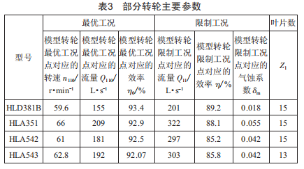 該電站水頭范圍為261.7~272.1m,適用于該水頭段的混流式轉(zhuǎn)輪型號(hào)主要有HLD381B、HLA351、HLA542、HLA543,其轉(zhuǎn)輪參數(shù)如表3所示。